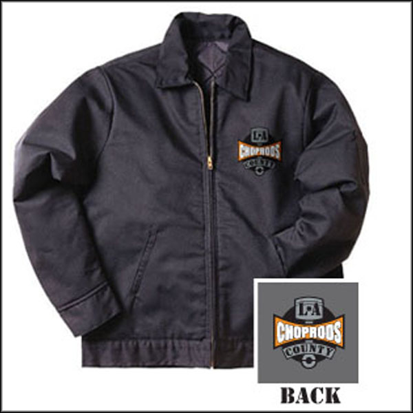 Features LACC Logo Patch on front with 12″ 4 color screen on back. Classic “Mechanic’s Shop Jacket” with light weight quilted lining. Solid brass zipper, 7.5 oz. twill, 65% polyester/35% cotton, permanent press, waist length with two button waist adjustment, two lower inset slash pockets and utility pocket on left sleeve. Permanently lined, black 100% nylon taffeta quilted to a 3.3 oz. polyurethane foam. Available in Black or Gray.