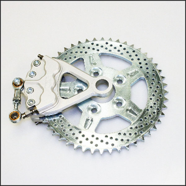 This 6 Piston Sprocket Brake kit is the first of its kind to hit the market. With it’s superior braking power you can stop even if you don’t use a front brake, although we don’t recommend that. The kit comes complete with 48 tooth sprocket rotor, caliper, brake pads, necessary mounting hardware and fittings including a stainless steel -03 brake hose fitting.Available for left hand or right hand drive, 3/4 inch or 1 inch axle, please specify Sprocket Disc Indexing Hole Size. All ISR Brake Components use ONLY DOT 4 brake fluid.