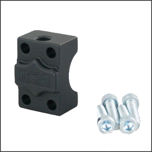 ISR Replacement Handlebar Mirror Clamp with Mirror Mount Thread. Finally, a clean way to add a mirror to ISR Hand Controls. Uses any standard Metric (10×1.25mm) Mirror Adapter and replaces the original handlebar clamp (fits 1″ handlebar diameters). Available in Clear or Satin Black Anodized to match our ISR Hand Controls. Sold each.